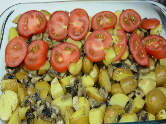 Dobra ideja za jednostavan, brz i ukusan ručak iz rerne. Šampinjoni će vas oduševiti svojim ukusom, a dekoraciju niko neće ostaviti na tanjiru. Mlade krompiriće možete van sezone da zamenite i sa crvenim krompirom, a dok ima mladih krompira, svakako iskoristite priliku da ih upotrebite.