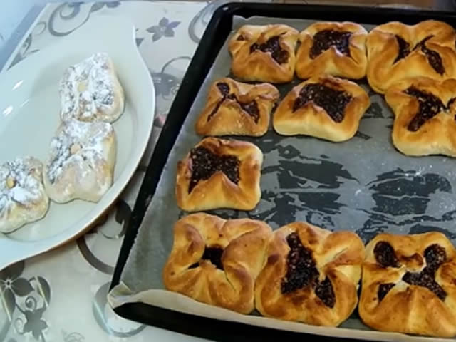 Nakon toga razvući koru seći kalupom ili čašom krugove u sredini staviti nadev.Nadev od džema pomešan sa lešnikom ili orasima.Peći u zagrejanoj rerni na 200c 20min.Vriće boščice odmah uvaljati u prah šećer i u sredinu dodati jedan lešnik