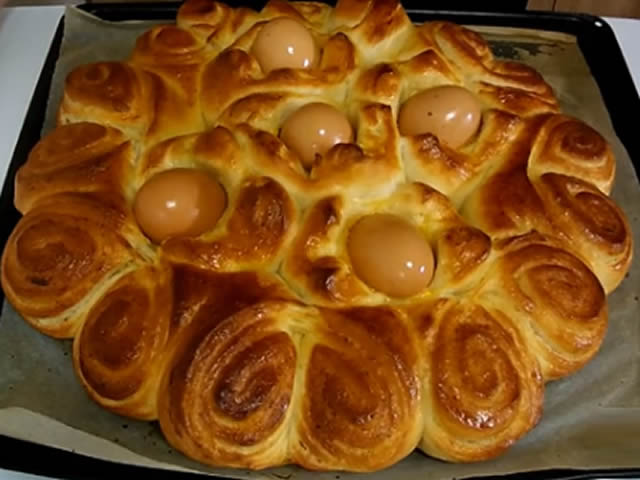Zamešeno testo odtaviti da odstoji odnosno naraste.Podeliti ga zatim na dve jufke.Od veće jufke razvući pravougaonu koru premazati je uljem i uviti u rolat.Rolat seći kao u videu.A od manje napraviti 5 jufkice zarezati makazama i ubaciti jaja.Premazati žumancetom i ostaviti da nadođe.Peći na 200c.
