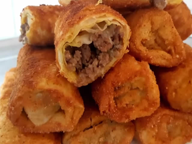 JEDNU POLOVINU JUFKE MALO PREMAZATI JAJIMA ILI MOZETE SAMO ULJE I MALO VODE STAVITI U POSUDICU PA POLOVINU JUFKE SAMO MALO POMAZATI DA SE LAKSE MOTA PRESAVITI DRUGU POLOVINU ISTO MALO PREMAZATI STAVITI KASIKU ILI DVIJE MESA UROLATI KAD ZAVRSITE ONDA BUREK U JAJA I PREZLU PRZITI NA SREDNJOJ TEMPERATURI DOK LJEPO NE PORUMENI.OVO JE VEOMA LAKO NAPRAVITI I ZA SVAKU PRILIKU JE VRLO JE NEOBICNO I BAS UKUSNO.CASA JOGURTA I JEDAN KOMAD OVOG BUREKA MMMM NJAMI.SIR MOZETE STAVLJATI PO ZELJI VAM