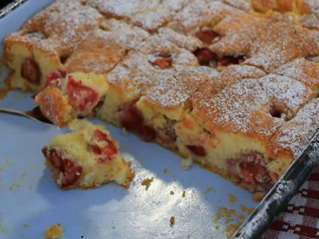 Očistite trešnje ili višnje. Uključite rernu da se zagreva na 200 stepeni. Podmažite tepsiju uljem i brašnom, dimenzije 30×25 (može i veća).