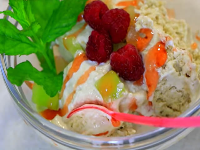 Poslužite uz komadiće sveže dinje, prelivom od malina i ako imate i koju svežu malinu bilo bi savršeno. Uživajte u divnom sladoledu ovog leta. Prijatno!