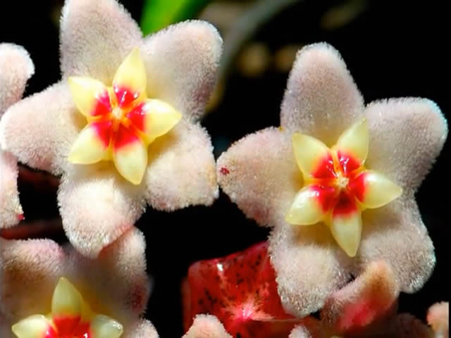 Ima mesnate zelene zimzelene, jajaste listove, duge 5-8 cm i bijele zvjezdaste cvjetove s crvenom pjegom u sredini koji rastu u gustim cvatovima. Cvjetovi imaju blag miris i tokom cvatnje ispuštaju tekućinu sličnu medu. Doba cvatnje počinje početkom lipnja i traje do jeseni.
