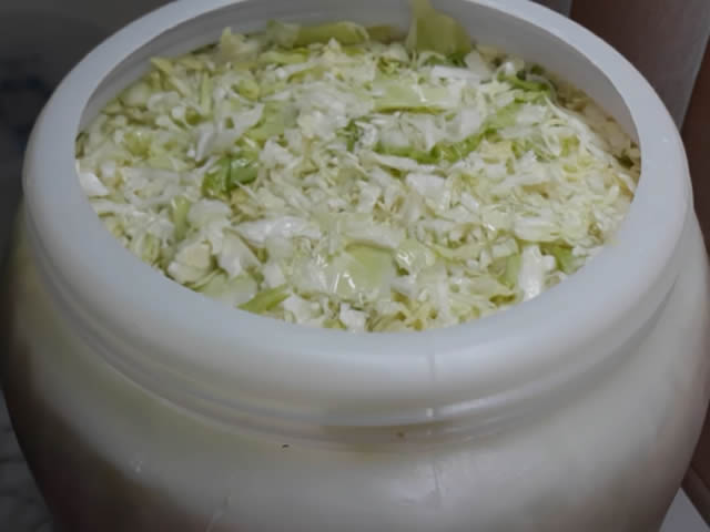 U 10 l hladne vode rastopiti 300 gr soli kada se so potpuno istopi preliti kupus.