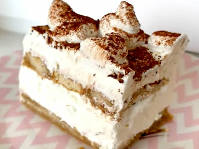 Prelep spoj kafe i kremaste torte sa piškotama. Torta se priprema veoma jednostavno i brzo. Možete da je jedete odmah, ali onda nemojte da je vadite iz kalupa.