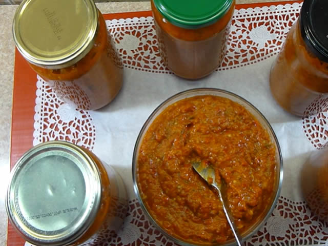 Dobro zagrejati ulje i pržiti ,kada ajvar počne da krčka pržiti 2 sata.Zadnjih pola sata dodati beli luk.Na kraju probati ukus i ako treba dodati možda malo soli ili malo secera .Sipati vreo ajvar u vruce tegle i okrenuti ih naopako.Zašuškat ih sa nekim debljim stoljnjakom ili cebetom . Prijatno!!!