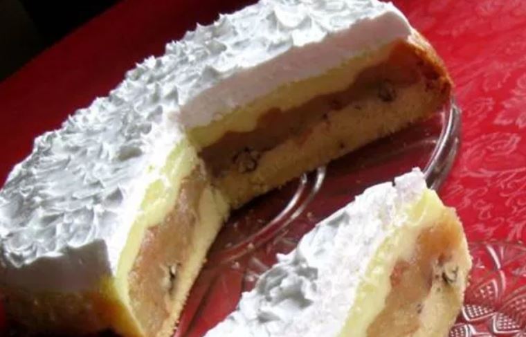 Kad se ispeče prevrnuti na tacnu, da jabuke dodju gore i preko jabuka posuti 100 gr seckanih oraha. U posudu staviti 8 dcl mleka, 5 kašika šećera i 2 pudinga od vanile, kuvati i kad se skuva malo prohladiti i staviti preko jabuka.