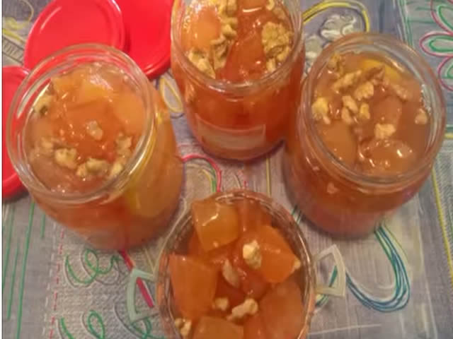 U toku kuvanja povremeno pokupite penu. Slatko kuvajte 25-30 min. na umerenoj temperaturu. Proverite da li je kuvano. Stavite kap na tacnu ako se ne razviva gotova je. Dodajte limun i orahe po zelji. Prekrijte mokrom krpom i ostavite da se ohladi. Hladno slatko stavljate u sterilisane tegle.