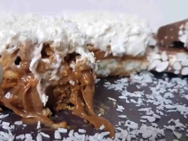 KUJNA | November 4, 2019 izvor:How 2 Bake It Sastojci: 100 g kokosa 1 žlica brašna (pola-pola) 1 žlica octa 100 g šećera 6 jaja 300 g čokolade s rižom 200 g margarina 100 g šećera 500 ml vrhnja za šalag Detalje pripreme pogledajte u videu: Breskvice – mekane i sočne s bogatim punjenjem Kokos kiflice sa čokoladom – odličan recept star 30 godina