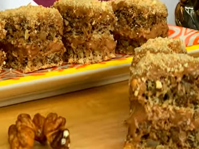 Prelep kolač sa orasima i čokoladnim kremom, koji ima samo jednu manu, brzo se pojede. Toliko je ukusan da se topi u ustima. Kora sa orasima je fina mekana, a čokoladni krem je jako ukusna. Kolač možete da sečete kao tortu, kao kocke, na štanglice, po vašoj želji.Ako hoćete kolač da poslužite kao sitne kolače , onda u fil dodajte malo mlevenog keksa ili orasa da bi krema bila gušća. Prijatno!