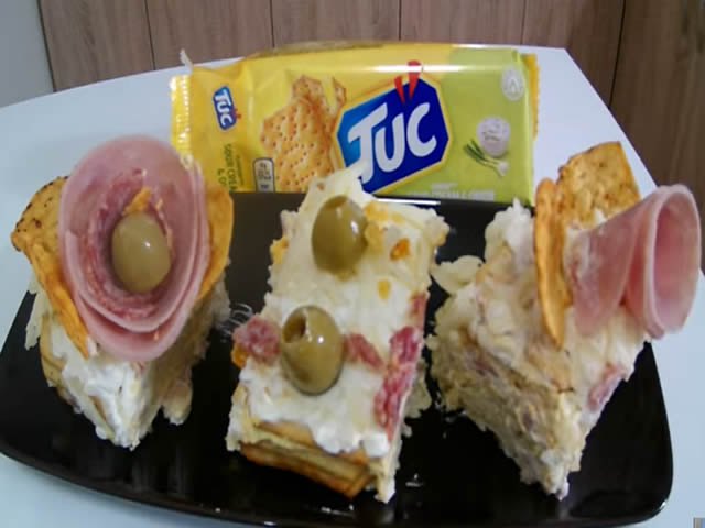 U svakom delu staviti različite sastojke po svom izboru ili kao na video snimku-Zatim na poslužavniku ili nekoj podlozi ređati prvo TUK keks pa jedan od nadeva preko ponovo keks i drugi nadev.Tako ređati naizmenično dok ne završite sa jednim od nadeva.Za dekoraciju možete koristiti masline.čajnu,parizer,krastavčiće,kačkavalj