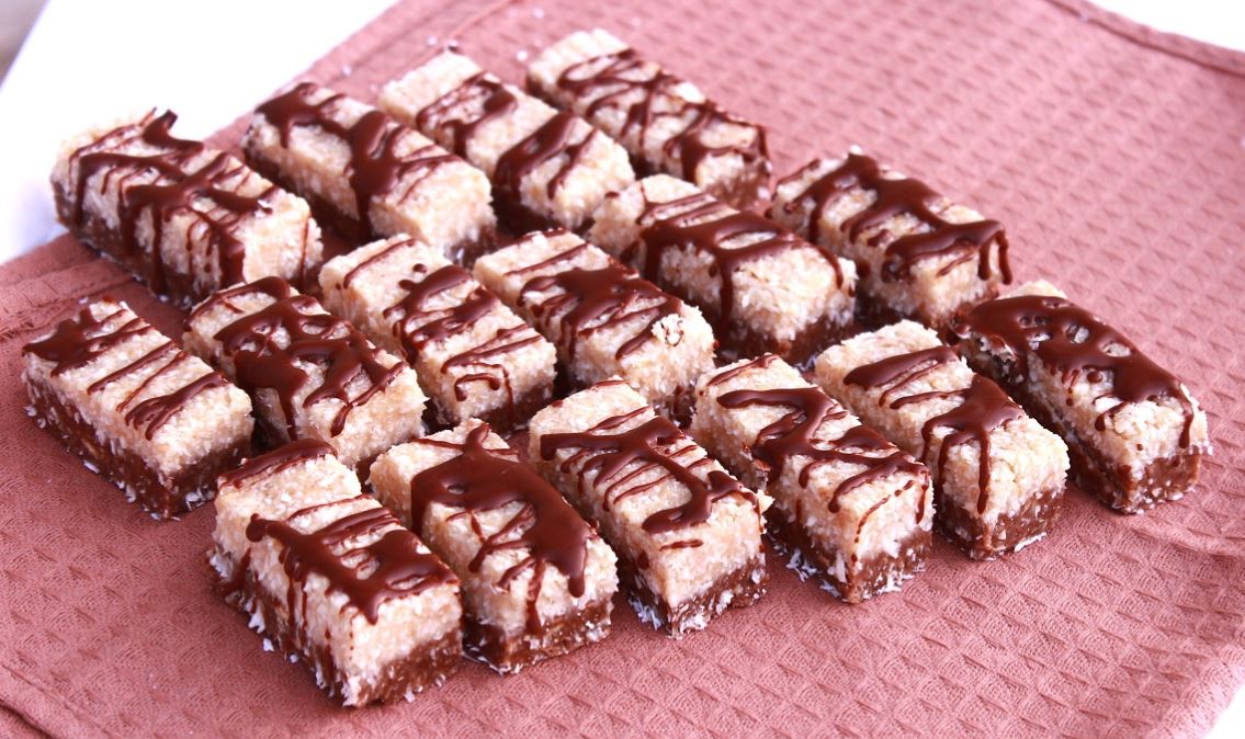 Ovaj svetli deo premazati preko tamnog i ostaviti u frižider da se stegne oko 2-3 sata. Seći štangle pa po želji preliti otopljenom posnom čokoladom ili posuti kokosom.