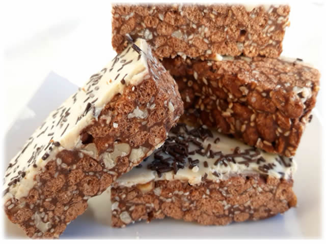 Hrskavi, umereno slatki, sjajan balans ukusnih sastojaka: meda, čokolade, oraha, kako flipsa, prženog susama i bele čokolade.