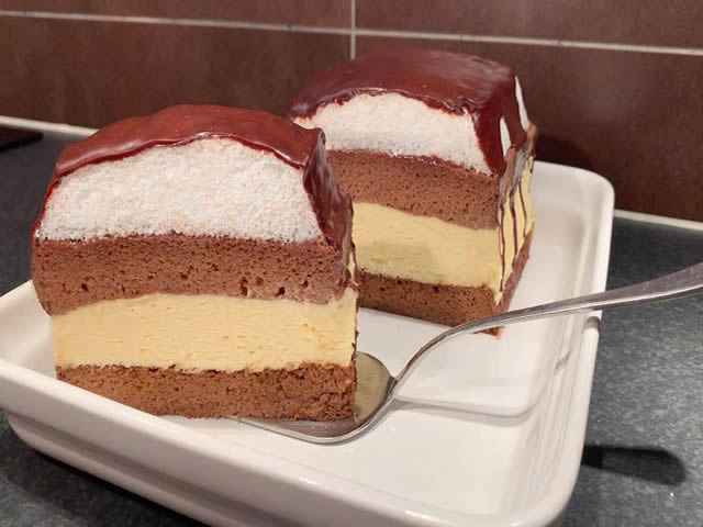 Prvu koru preliti sa 125 ml crne kafe ili čokoladnog mleka pa staviti cjeli krem, pa staviti drugu koru i preliti sa preostalim milijekom.