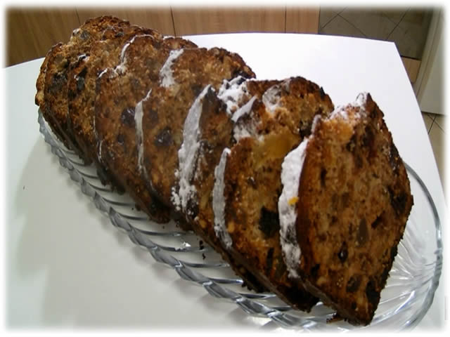 Omekšali puter umutite sa šećerom a zatim dodati jedno po jedno jaje i dalje muteći žicom ili mikserom.U umućeno dodati voće i po 100gr.crne i 100gr. bele čokolade narezane.Zatim dodati brašno pomešano sa pecivom.Sve ovo sjedinite i izručite u pleh obložen pek papirom 10/25/10cm.Kolać pecite na 160c-1h.i 30min.Kad uhvati koricu pokrite ga folijom da ne pocrni.Dobro ohlađeni kolač posipajte bogato šećerom u prahu ili prelijte glazurom od 200gr.čokolade