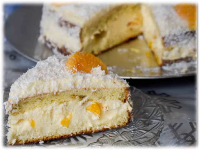 Zimska torta sa mandarinama je jako jednostavna za pripremu. Takoreći klasičan fil i korice u kombinaciji sa karamelizovanim mandarinama, posuta kokosovim brašnom. Torta nije mnogo skupa a izdašna je, idealna za novogodišnje praznike.