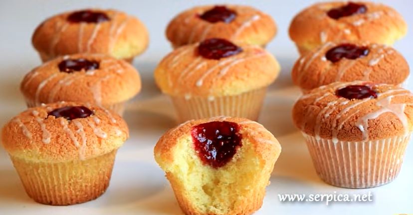Izvadite malo sredinu mafina pa filujte đžemom. Odozgo možete prošarati umućenim limunom i šećerom u prahu.