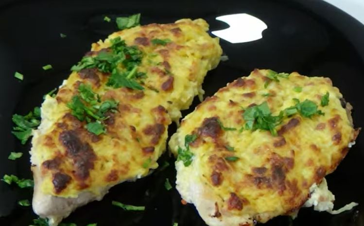 Pileći file poređati u pleh pomašćen odozgo staviti nadev i peći na 180c.15min.