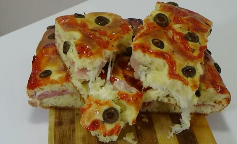 Zamešenu i napunjenu pogaču dekorisati kečapom i narezanim maslinama.