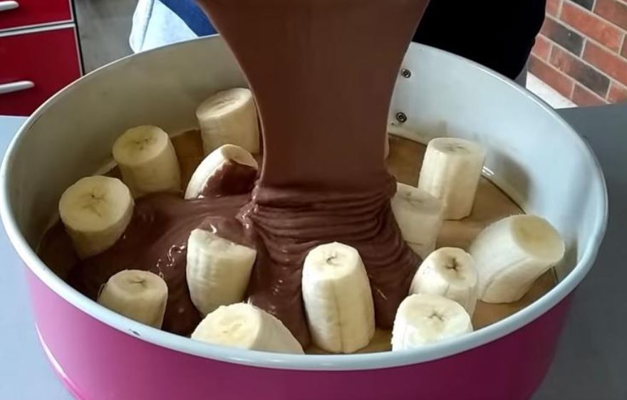 Sastojci: 300 g brašna, 300 g šećera, 50 g kakao praha, 1/3 kašičice soli, 1 kašičica vanil šećera, 1 kašičica sode bikarbone, 4 jaja, 300 ml mleka, 50 ml ulja, 60 g putera, 4 banane, 1 kašika sirćeta, kokos za dekoraciju.