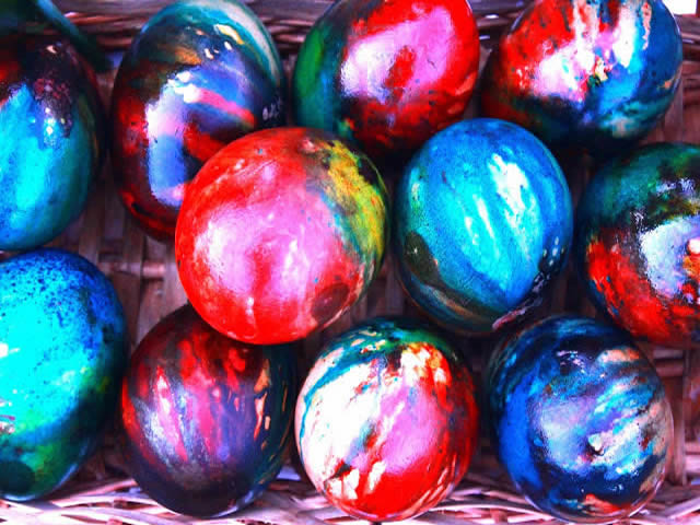 Sastojci i priprema: oko 10 – 15 jaja, boja u kesici (po dve od svake)crvena, plava, zelena i ljubičasta su najbolje, alkoholno sirće (otprilike jedna čaša), limena cediljka sa rupicama.
