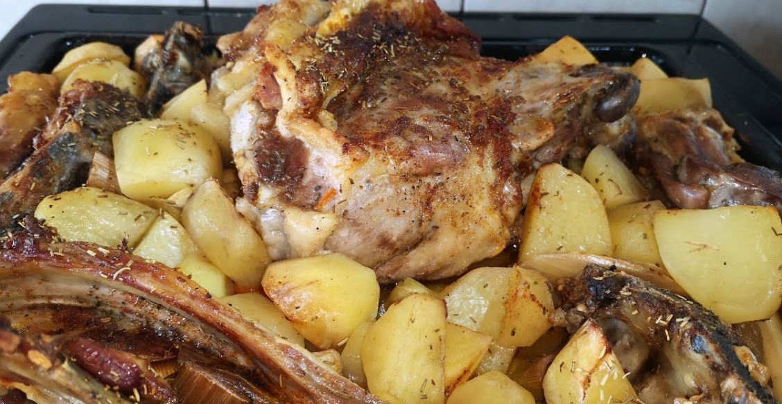 Jagnjetina pecena u rerni sa krompirom, sargarepom, belim vinom, ruzmarinom, belim lukom i crnim lukom ukusna i mekana kao ispod saca a u kucnim uslovima spremana.