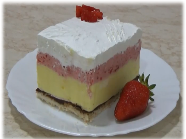 Kora se filuje prvo žutim filom. Potom se stavlja fil od jagode. Na kraju se stavlja preostala polovina slatke pavlake.