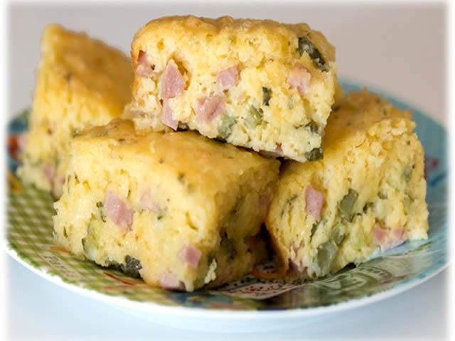 Sastojci: Po jedna čaša od jogurta rendanog kačkavalja (80g), seckane šunke (120g), seckanih kiselih krastavčića (130g), brašno (120g), 1 kiselo mleko, pola čaše ulja (80ml), 1 kesica praška za pecivo, 4 jaja, 1 kašičica origana, 1 kašičica soli, malo margarina ili putera za podmazivanje.