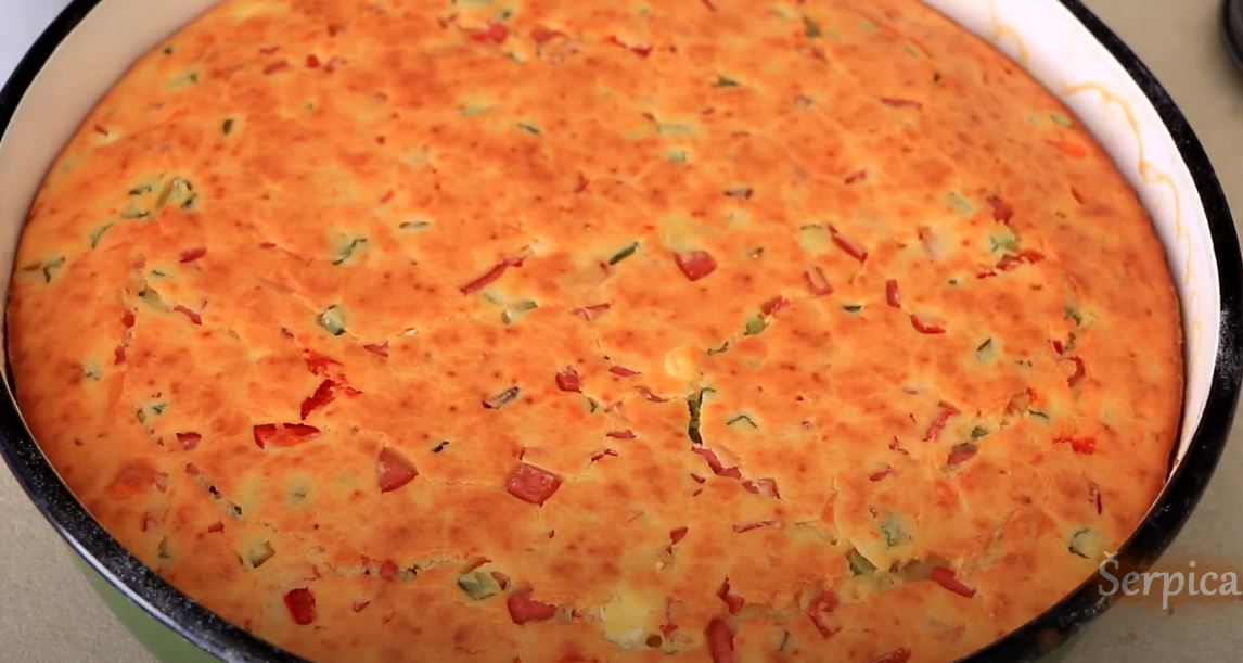 Umutite 5 jaja i dodajte sve ostale sastojke osim susama. Dobro izmesajte da ne bude grudvica pa umešajte iseckan sir, salamu, krastavce i papriku. Stavite susam ako zelite. Odmah stavite u vruću rernu i pecite oko 35 minuta. Proverite čačkalicom. Isecite kada se malo prohladi da bi kocke imale ravne ivice. Ako volite vruću možete je i odmah seci. Prijatno!