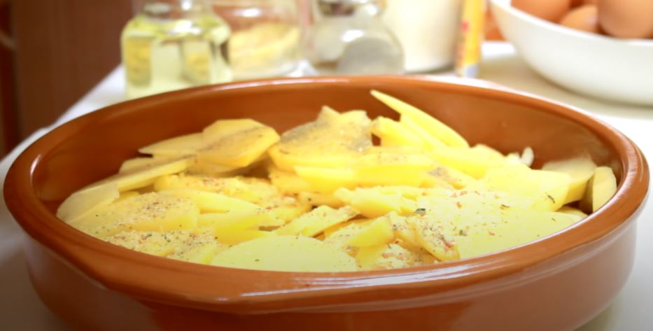 Luk iseći sitno, krompir na kolutove zatim sve izmešati i začiniti. Preliti sa vodom i uljem i peći na 240 stepeni dok krompir ne omekša.