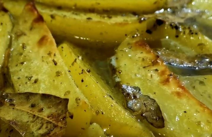 600gr krompira; 150ml maslinovog ulja; 5 čenova belog luka; origano; 5 listova lovora; so i biber; 150ml vode; 1 limun.