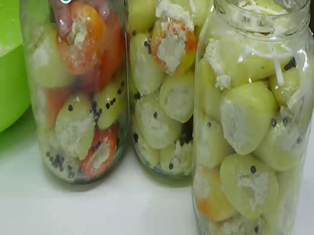 Paprike sačekati da se prohlade napuniti sirom i režati u tegle dodajući biber u zrno.Porežane paprike zaliti vodom u kojoj su se paprike barile.Zatvorite tegle i staviti da se pasterizuju u vodi.Vreme pasterizacije od ključanja 15min.pa ostaviti do sutradan da se ohladi u vodi.