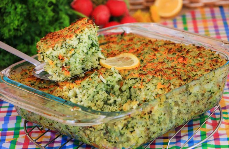 Pirinač operite i skuvajte. Izdinstajte luk pa izmešajte sa kuvanim pirinčem, dodajte iseckan beli luk, peršun, iseckan spanać. Začinite i stavite u tepsiju. Odozgo narendajte mali komadić šargarepe. Pecite na 220 stepeni oko 20 minuta.