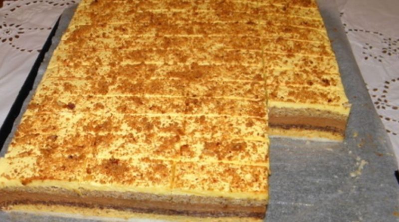 Bijeli biskvit – krema sa lješnjacima – čokoladni biskvit – čokoladna krema – biskvit sa lješnjacima – žuta krema. Gore se pospu mljeveni lješnjaci.
