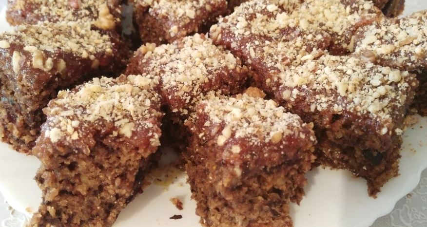 4 kašika pekmmeza od šljiva i sve dobro izjednačiti žicom. Sipati u pleh veličine 26 sm u koji ste stavili peh papir. Peći na 200 stepeni C 40- 45 min. Na polovini pečenja pokriti folijom. Vruć kolal premazati djemom po izboru i posuti ml. i seckanim orasima.