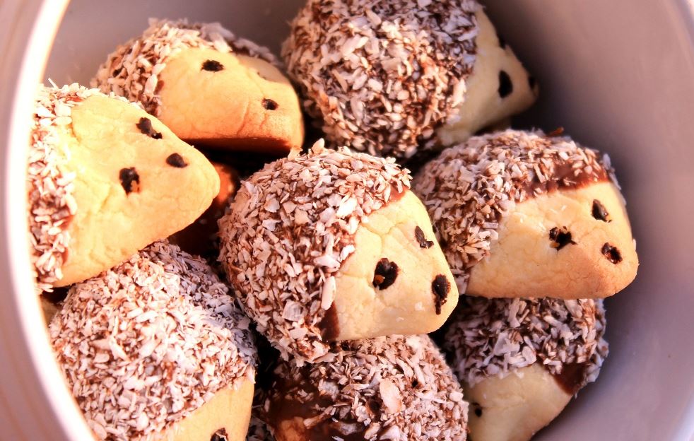 Pečene ostaviti da se malko prohlade, umočiti jedan kraj u čokoladu i zatim u kokosovo brašno. Čačkalicom iscrtati oči i njuškicu.