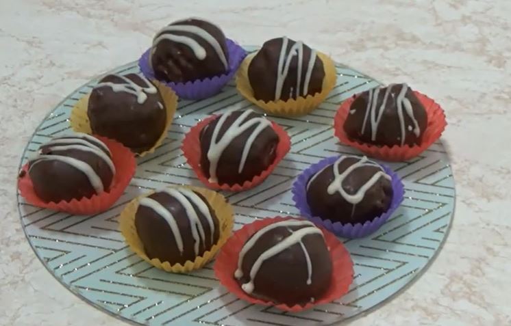 Pomešati margarin i šećer u prahu. Zaleđenu pomorandžu izrendati sa sve korom i dodati u margarin. Zatim dodati mleveni keks, umešati i umesiti. Od smese praviti kuglice. Istopiti crnu čokoladu sa uljem. Kuglice potapati u glazuru i stavljati na papir za pečenje. Ostaviti ih u frižideru da se stegnu i ohlade. Istopiti belu čokoladu sa uljem pa našarati kuglice.