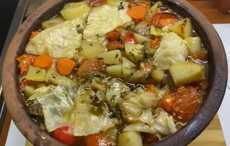 Povrće iseći i začiniti po ukusu. Zemljanu posudu premazati mašću. Pa redjati meso i povrće naizmenično. Naliti vodom i peći 2,5 do 3h u rerni na 200 stepeni. Prijatno!