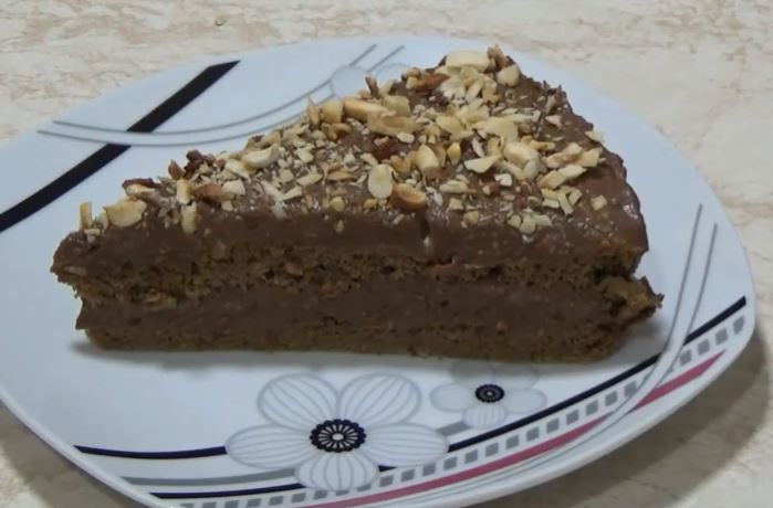 Koru preseći na dva dela. Nafilovati prvu koru, staviti drugu koru preko i nafilovati celu tortu. Na kraju posuti tortu seckanim lešnicima.