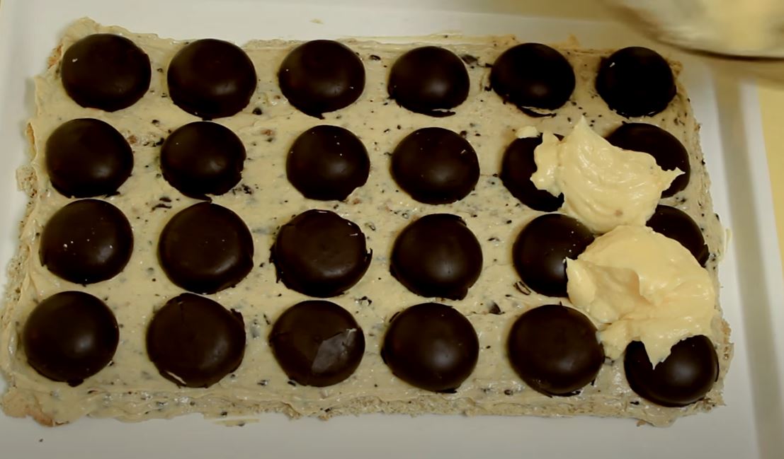 Svakoj mančmelou čokoladici odvojiti penasti deo od keksa, podloge. Keks izmrviti i dodati u jedan deo fila. Drugi deo fila ostaje bez dodataka.