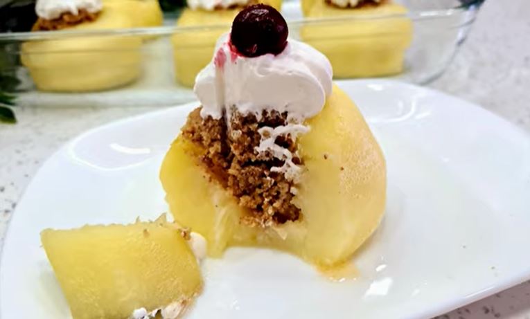 FILOM NAPUNITI JABUKE,PRELITI SIRUPA MALO PREKO SVAKE JABUKE, ODGORE IH UKRASITI SLAGOM I VISNJOM
