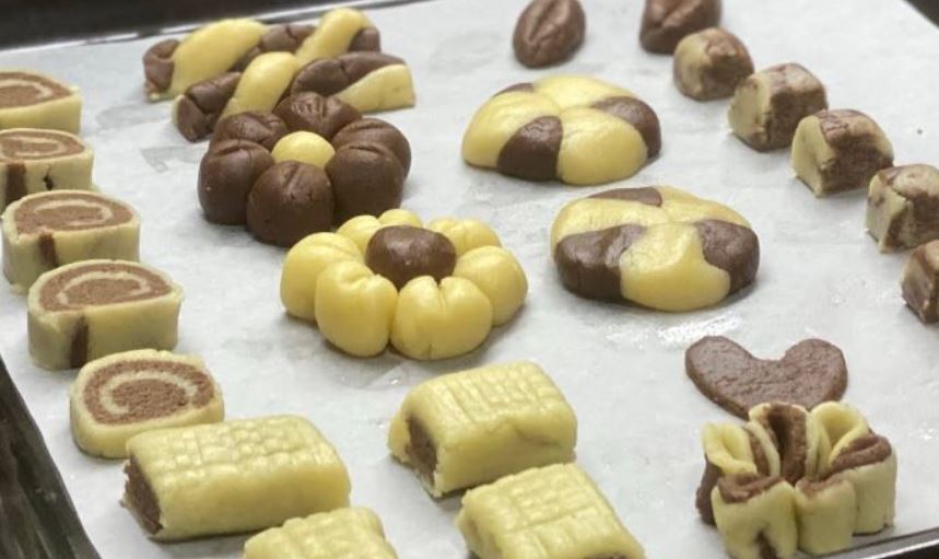 Priprema: Umutite maslac i šećer, a onda dodajte brašno. Dobijeno testo razdvojite na dva različita dela. Jedan deo ostavite takav kakav jeste, a u drugi deo dodajte kakao. Dobijeno testo uvijte u dve folije pa ostavite u frižideru da se odmori oko pola sata, a može i više.