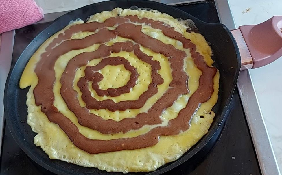 Odvojiti dve kutlače u drugu činiju pa ubaciti kakao i izmutiti bez grudvicama dodati još malo testa. Sipati u podmazan tiganj jednu kutlaču treste i da se malo zapeče.