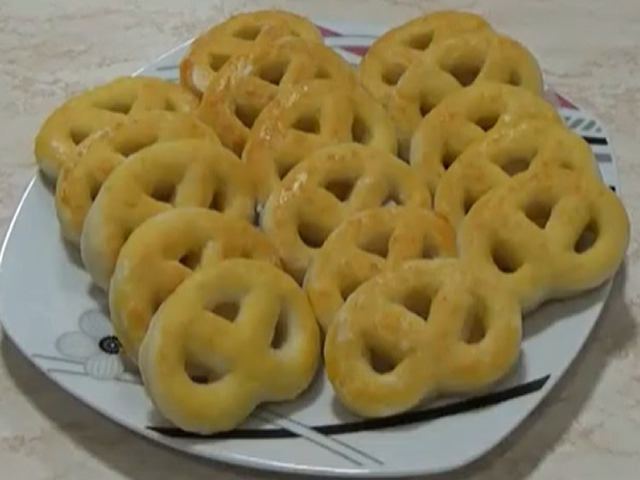 Naraslo testo rastanjiti na debljinu 1 cm. Kalupom za perece seći testo (vaditi perece). Perece složiti u pleh na papir za pečenje i premazati ih umućenim jajetom. Perece staviti u rernu zagrejanu na 200 stepeni da se peku od 10 do 15 minuta.