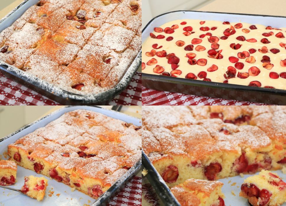 Prespite u podmazan pleh, poređajte voće i pecite od 30 – 40 minuta. Kolač ostavite da se dobro ohladi pa ga isecite, pospite prah šećerom i poslužite. Prijatno.