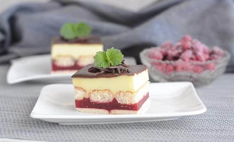 Ovaj kolač je zaista ukusan i brzo je gotov. Nema pečenja, a kreme nije potrebno hladiti…samo složite vruć kolač i posao je gotov. Umjerene je slatkoće, a vanilija i malina se odlično slažu.