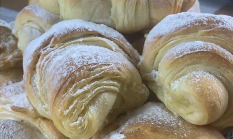 Kvasac aktivirati i umesiti glatko testo. Ostaviti da naraste, zatim iseći u šesnaest delova. Svaki deo razviti u mali krug i premazati margarinom. Krugove redjati jedan preko drugog. Ostaviti da naraste. Razviti veliki krug i iseći u željene delove. Namazati kremom, napraviti kroasan. Peći na 180 stepeni 25-30min. Prijatno!