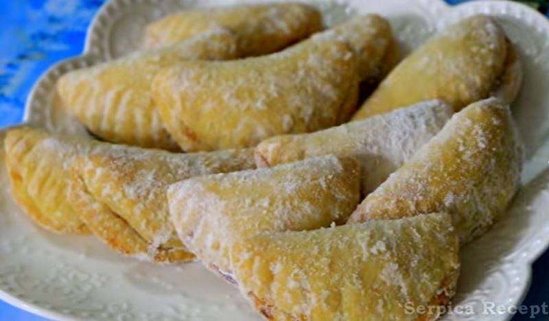 Izmešajte vodu, vanilin, šećer, prašak za pecivo, ulje, sirće. Dodajte brašno i zamesite meko testo. Ostavite da stoji 10 minuta pa premesite. Čašom prečnika 6 cm. ili 8 cm. vadite kolutove, na svaki stavite malo džema, preklopite i viljuškom pritisnite krajeve. Pecite u zagrejanoj rerni na 200 stepeni oko 30 – 35 minuta. Treba da blago porumene sa svih strana. Vruće uvaljajte u šećer. Prijatno!