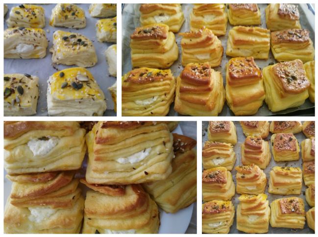 Preko sira stavite još 4 kore stim što zadnju koru nemojte mazati. Nožem seći pogačice tako da Vam u svaku pogačicu ostane sir. Namazati žumancetom u koji ste dodali malo ulja. Pogačice posuti sa semenkicama, kimom i krupnom solju.