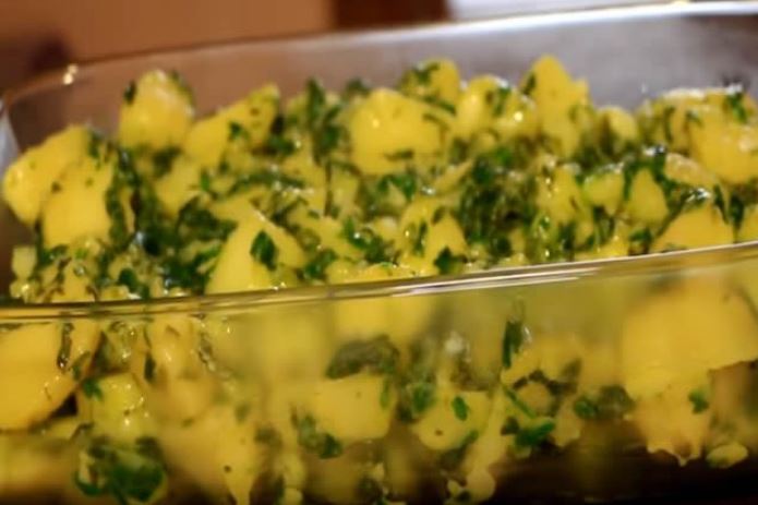 Krompir obarite u ljusci, ostavite da se ohladi, ogulite ga i isecite na kocke. Pripremite i spanać, operite ga i iseckajte. Zagrejte billjnu mast ili ulje pa dodajte sitno iseckan beli luk, pržite par sekundi, posolite pa dodajte spanać. Promešajte, poklopite i na tihoj temeraturi ostavite da krčka oko 2 minute. Dodajte limunov sok i krompir, promešajte opet poklopite i ostavite 10 minuta da se dinsta.